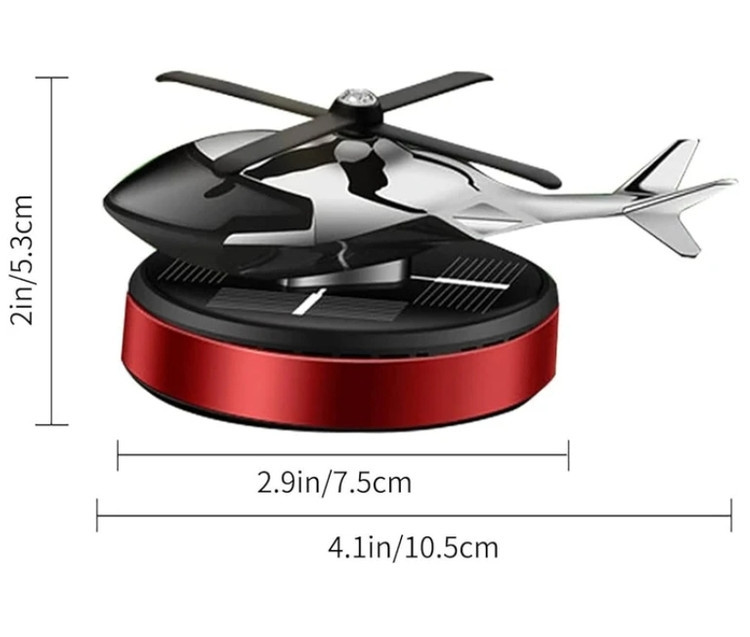 خوشبو کننده خورشیدی مدل هلیکوپتر علاوه بر خوشبوکننده بودن یک وسیله تزئینی باحال و جذاب برای داخل خودرو میباشد و این محصول با قرار گرفت در زیر نور خورشید به چرخش در میآید و بوی خوشایندی رو داخل کابین پخش میکند. راحیه این محصول قابل شارژ میباشد و شما میتوانید به صورت جداگانه هر ادکلن و راحیه خوشبو و ملایم رو برای این محصول استفاده کنید. انرژی محرک این خوشبو کننده خودرو خورشیدی از خورشید تولید می شود و نیاز به شارژ ندارد.